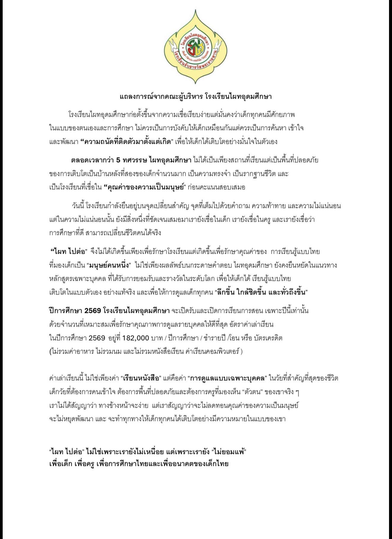 แถลงการณ์จากคณะผู้บริหาร โรงเรียนไผทอุดมศึกษา